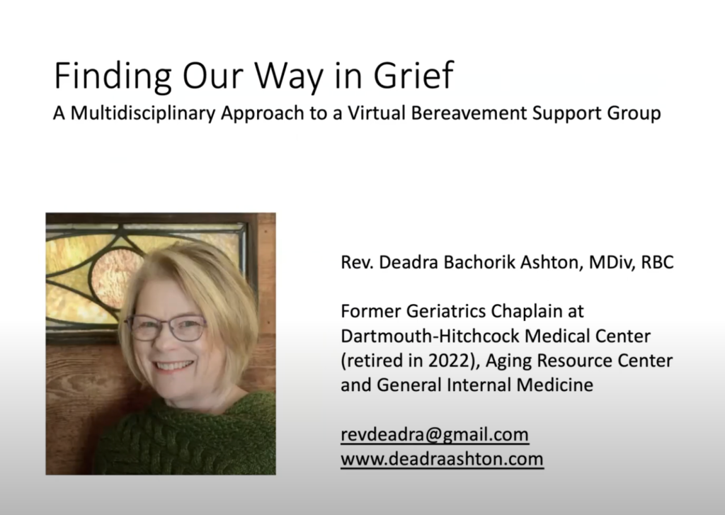 Rev. Deadra B. Ashton and writer/storyteller Marv Klassen-Landis share how they launched a unique online bereavement support group at the Dartmouth-Hitchcock Medical Center to help grieving patients through creative story telling.